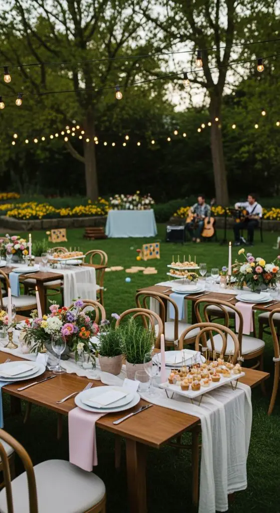 For spring garden party entertainment ideas, consider lawn games, acoustic musicians positioned near flower beds, and cocktail stations featuring botanical-inspired drinks. These elements reshape ordinary outdoor spaces into romantic celebration venues.