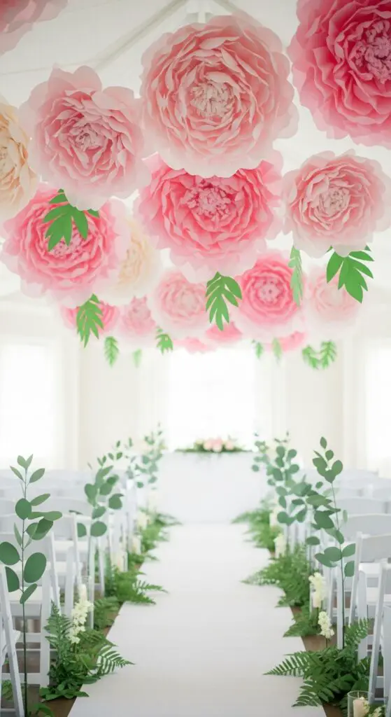 Create oversized peonies using soft pink tissue paper, layering petals for realistic depth and texture. Hang clusters at varying heights above your ceremony space for dramatic visual impact.