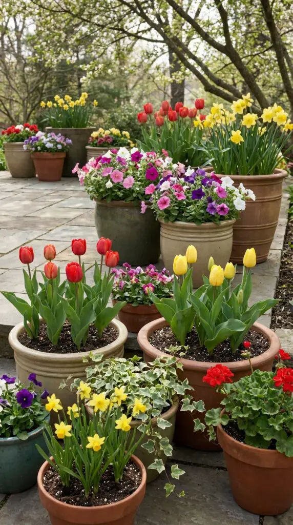 I recommend choosing containers of varying heights and sizes to create visual interest throughout your yard. Plant a variety of tulips and daffodils in larger pots, mixing different colors and bloom times for extended seasonal appeal. Don’t forget to incorporate hanging baskets with trailing plants like petunias or ivy geranium for vertical dimension.