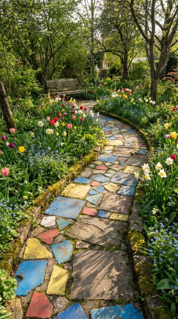 Colorful stepping stones alter ordinary garden paths into eye-catching walkways that guide visitors through your outdoor space while protecting delicate plants from foot traffic.