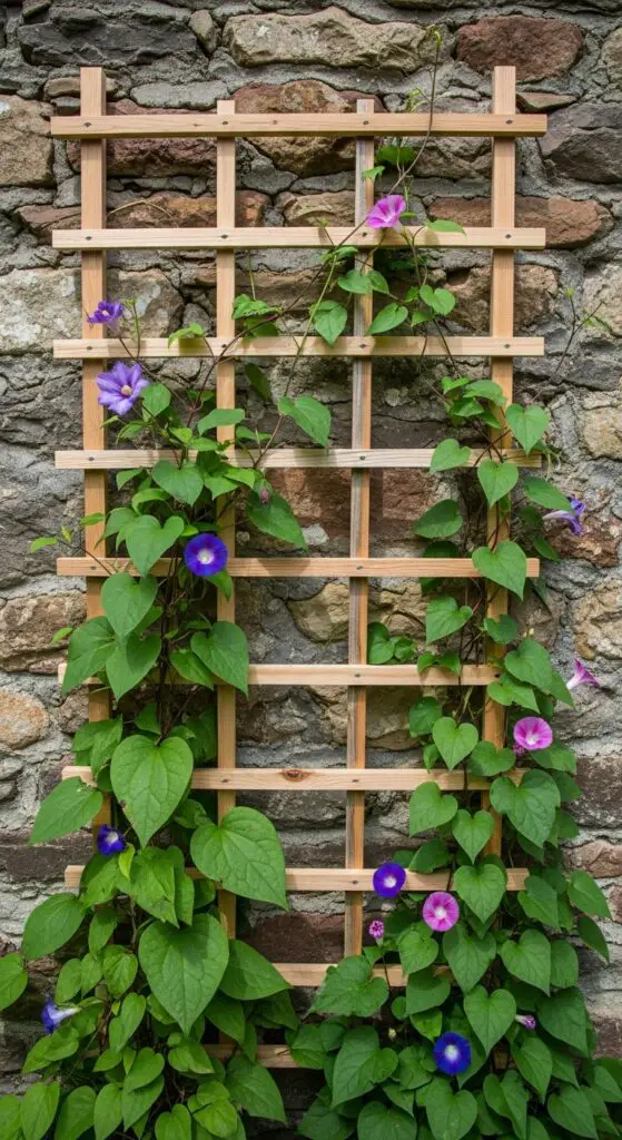 Cut two vertical posts and three horizontal crossbeams, then attach wire mesh or wooden slats between them. Mount your finished trellis securely against a wall or insert posts directly into soil. You’ll create an attractive backdrop that encourages upward growth while maximizing your garden’s potential.