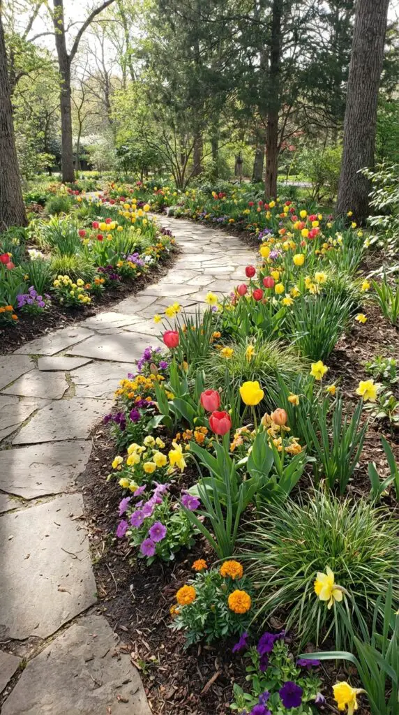Select seasonal plantings that bloom sequentially from early spring through late fall. Plant tulips and daffodils for initial spring color, followed by petunias and marigolds for summer vibrancy. Add ornamental grasses for texture and movement.