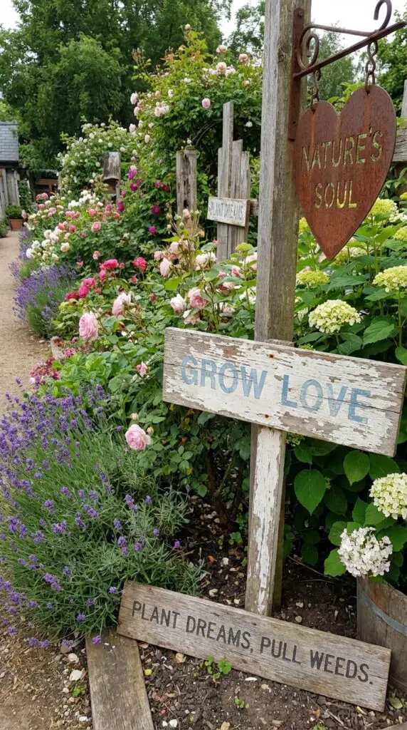 Weathered wooden signs and hand-painted inspirational messages alter ordinary garden spaces into charming retreats that reflect your personality. I recommend positioning vintage markers near garden entrances or along pathways where visitors naturally pause to read them. Choose rustic metal signs featuring botanical themes or playful gardening puns that complement your landscaping style.