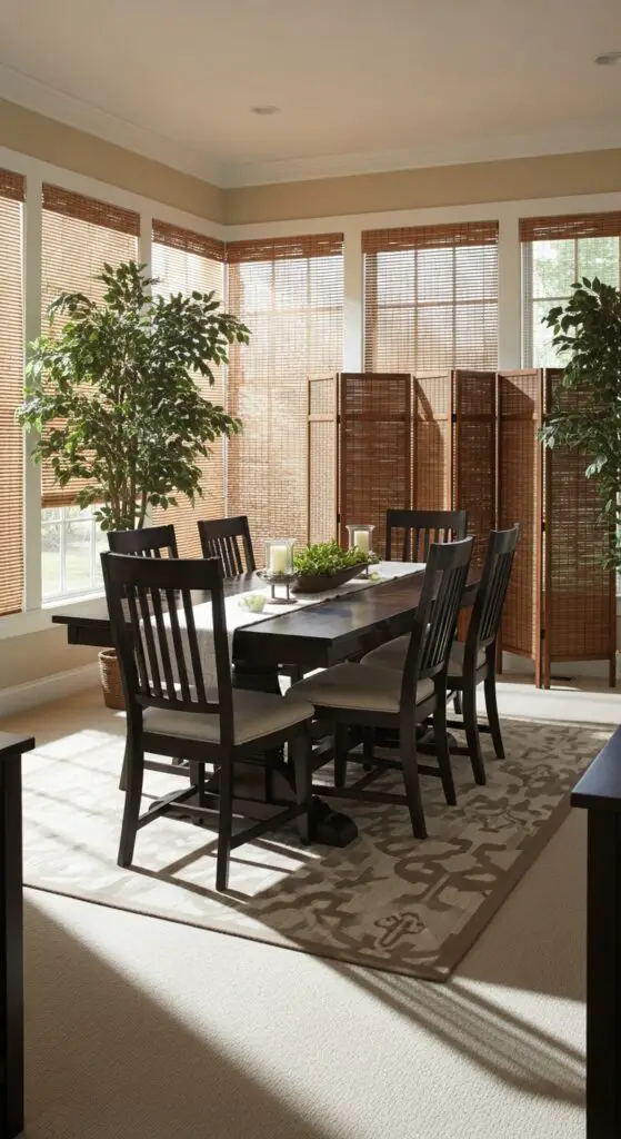 Second, position furniture to maximize sightlines toward your best views while creating natural barriers for intimate conversations. Third, optimize layout flexibility by incorporating moveable screens or tall plants that provide selective screening without permanent obstruction. These solutions let you control visibility and comfort levels while preserving your sunroom’s airy, open atmosphere for memorable dining moments.