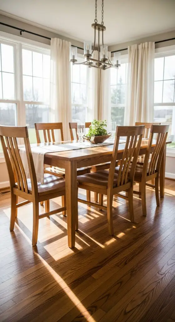 Natural wood tones metamorphose your sunroom dining area into a warm, inviting space that balances the abundance of natural light with earthy textures. You’ll create visual depth by selecting furniture pieces with varying wood finishes—from light oak to rich walnut.