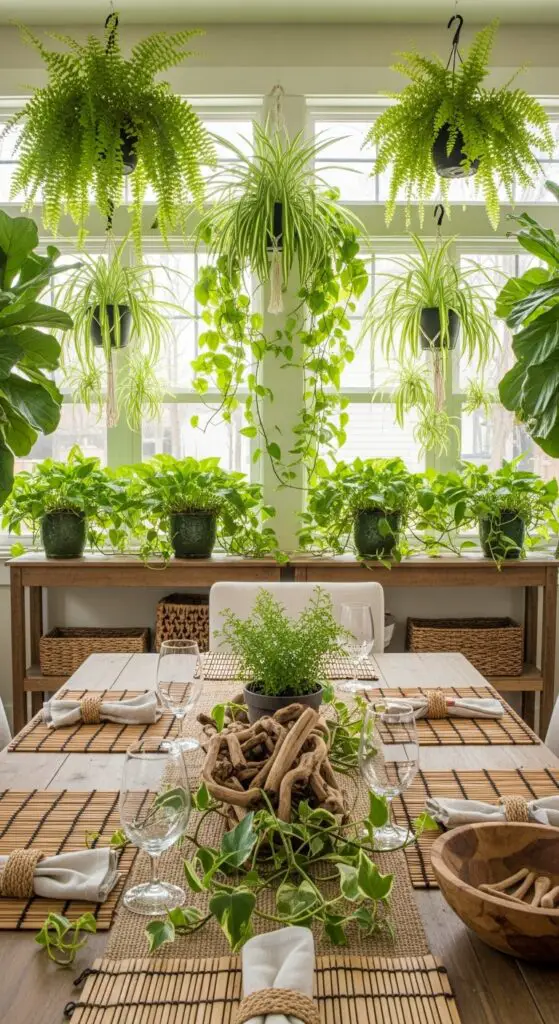 Incorporate hanging plants like Boston ferns or spider plants from ceiling hooks to maximize vertical growing space. Curate trailing vines such as pothos or English ivy along window ledges for cascading drama. Add bamboo placemats, jute table runners, and wooden serving bowls to enhance the organic atmosphere. Place large floor plants like fiddle leaf figs in corners to anchor the botanical theme effectively. Consider incorporating rustic wood elements like reclaimed wooden shelving or driftwood centerpieces to emphasize the natural charm and create visual texture against the abundant greenery.