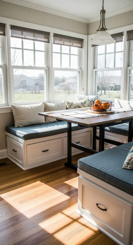 Alter your sunroom into an inviting breakfast haven by incorporating built-in seating that maximizes both comfort and space efficiency. Cozy bench seating along windows creates intimate dining spots while freeing up floor space for movement.