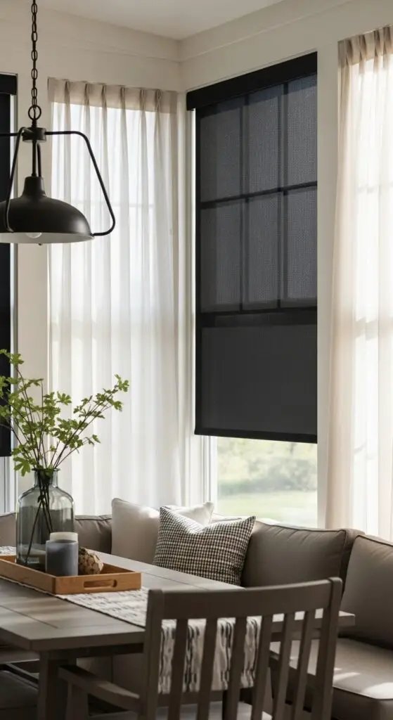 Although sunrooms offer abundant natural light, you’ll need strategic window treatments to control glare and create comfortable dining conditions throughout the day. Consider blackout shades for maximum light control during intense afternoon sun or when you want complete darkness for evening entertainment. These versatile options give you total freedom to adjust your space’s atmosphere instantly.