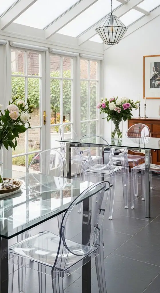 Prioritize space saving solutions by selecting stackable acrylic chairs or nesting glass side tables that disappear visually when not needed, giving you maximum flexibility.