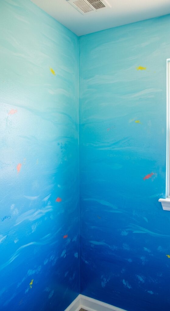 Master these water gradient techniques by working in small sections to maintain wet edges. Essential sponge painting tips include using natural sea sponges for authentic texture and dabbing motions rather than wiping. Layer colors gradually, allowing each section to flow into the next for seamless oceanic depth. Consider incorporating bold colors alongside your blues to create dynamic contrast and make the underwater theme more engaging for children.