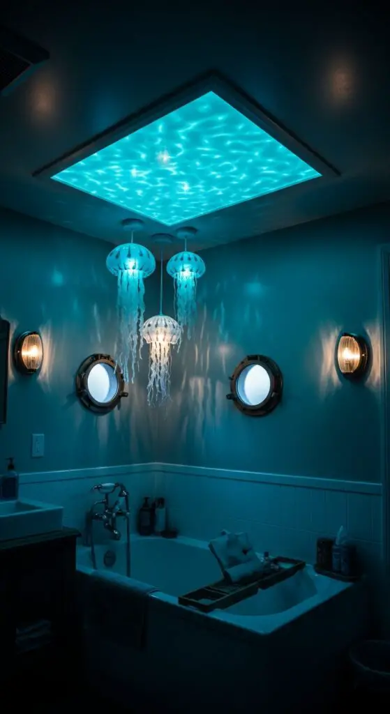 Alter your child’s bathroom into an enchanting underwater world with nautical lighting fixtures that recreate the mysterious depths of the ocean. Install glowing bioluminescent lights along the ceiling or walls to simulate deep-sea creatures’ natural illumination. These LED strips create an ethereal blue-green glow that transforms ordinary spaces into magical underwater domains.
