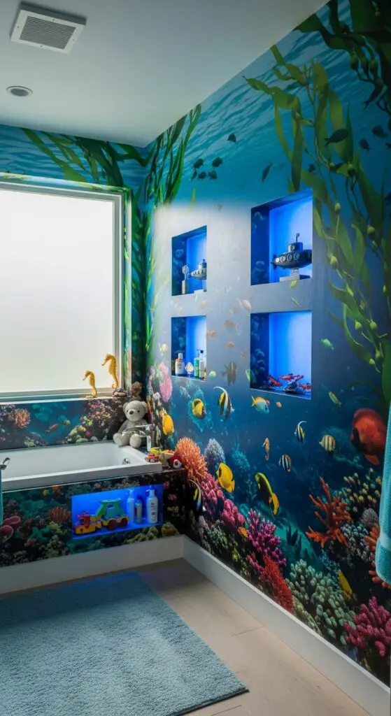 Navigate through 13 magical underwater bathroom designs that will transform your child’s daily routine into an oceanic adventure they’ll never want to leave.