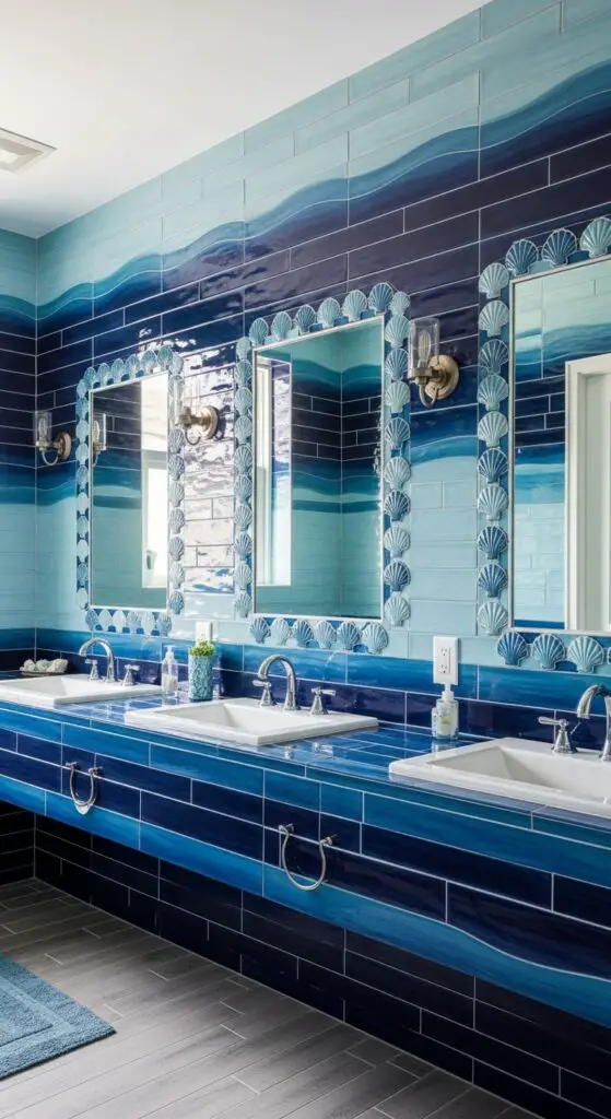 Shell shaped tiles work perfectly as accent pieces within your wave design, adding textural interest and reinforcing your ocean theme. Position these decorative elements strategically around mirrors and fixtures to enhance your underwater paradise.