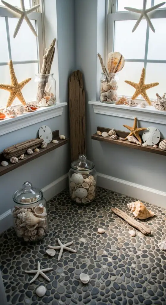 Your pebble tile flooring provides the perfect foundation for scattered sand dollars and sea glass pieces. Mount shadow boxes filled with various shells at kid-friendly heights, allowing little hands to investigate different textures safely.