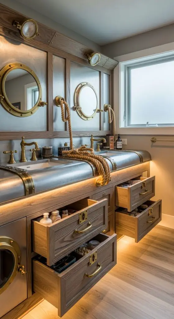 Beyond towel storage, your bathroom vanity presents the perfect opportunity to create an underwater command center that metamorphosizes daily routines into submarine expeditions. Redefine standard cabinets into periscope-equipped submarines using metallic paint and circular porthole mirrors. Install LED strip lights underneath for an authentic underwater glow effect.