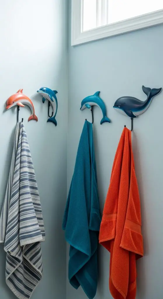 Metamorphose ordinary towel storage into playful ocean creatures that’ll make your kids actually want to hang up their towels after bath time. Dolphin themed shower hooks feature curved bodies perfect for gripping wet towels while adding aquatic charm to bare walls. Install these cheerful creatures at child-appropriate heights to encourage independence and responsibility.