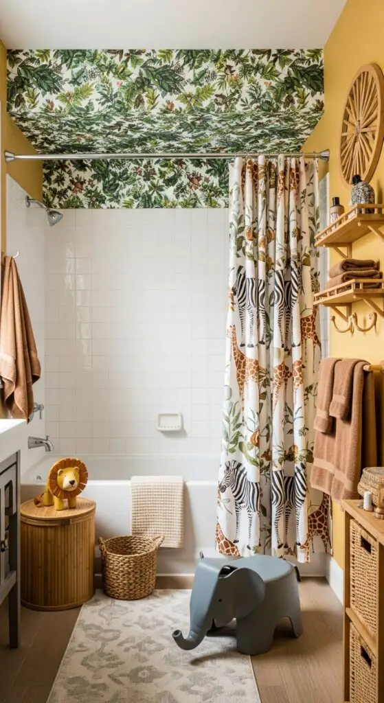 Create a jungle canopy effect using green leafy wallpaper or wall decals above the bathtub area. Install animal-print shower curtains featuring zebras, giraffes, or leopards that appeal to all children. Add safari-themed accessories like wooden animal figurines, bamboo storage baskets, and earth-tone towels.