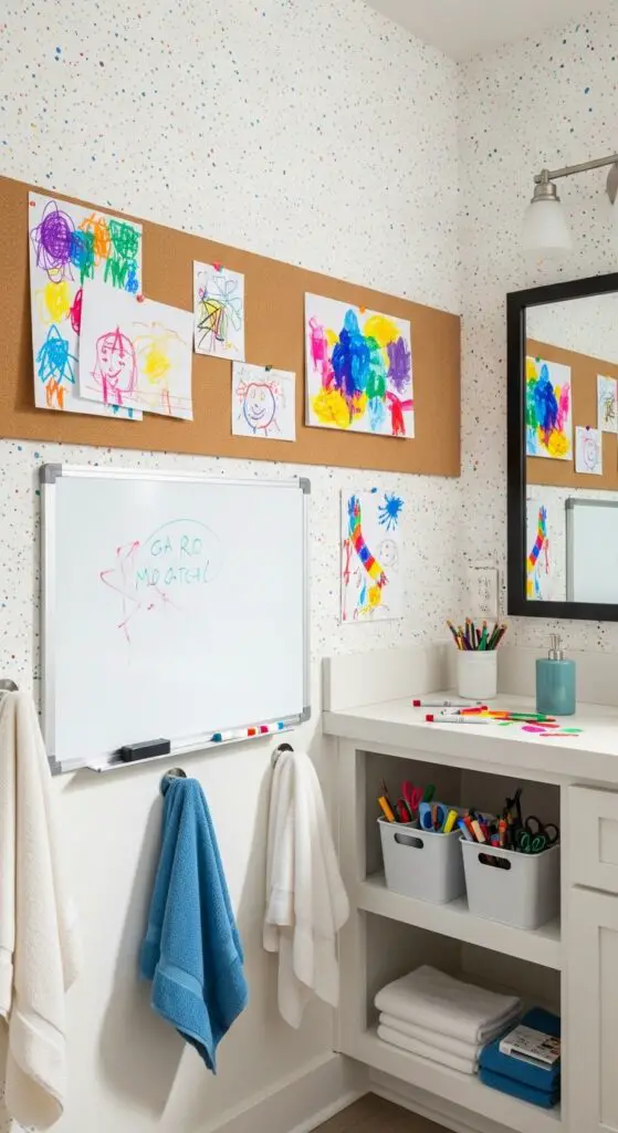 Create dedicated craft activity stations with waterproof storage bins containing washable markers, colored pencils, and sketch pads. Mount a whiteboard at child height for spontaneous doodling during bath time. Choose lively, paint-splatter-inspired wallpaper or decals that celebrate creativity.