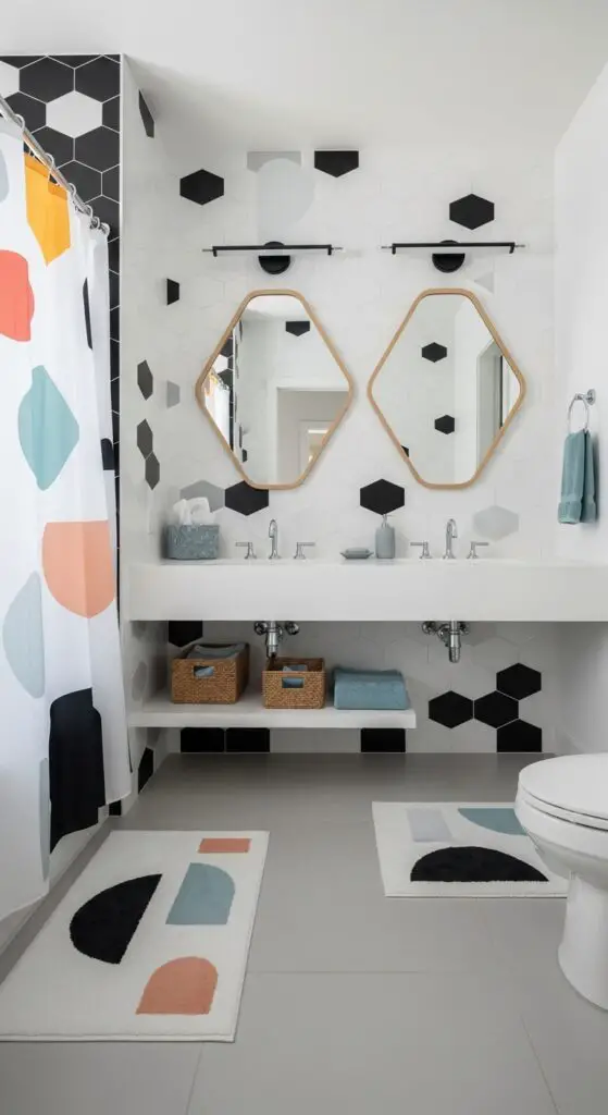 Abstract shape patterns work beautifully on shower curtains, bath mats, and towels without overwhelming the space. Consider incorporating circles, squares, and zigzag designs in neutral color palettes of black, white, gray, or muted pastels. This approach gives your kids freedom to personalize their space while maintaining a sophisticated, timeless look that’ll grow with them. Modern bathroom designs with clean lines and stylish fixtures perfectly complement geometric patterns while maintaining the kid-friendly functionality your family needs.