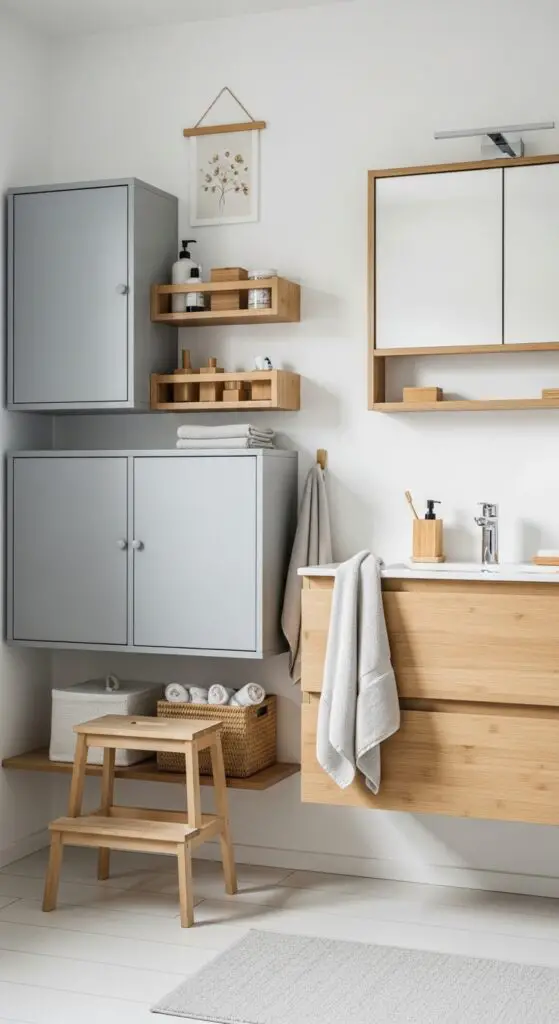 Choose streamlined fixtures without ornate details to maintain the minimalist aesthetic. Install floating vanities and wall-mounted storage to create that signature light airy atmosphere. Add natural textures through bamboo accessories, wooden step stools, and cotton towels. This approach grows with your children while promoting independence through organized, clutter-free surroundings that encourage responsibility.
