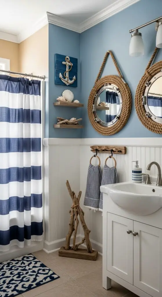 Commence your child’s bathroom into a maritime odyssey by incorporating nautical elements that bring the calming essence of the sea indoors. You’ll create an adventurous space using beachy coastal touches like rope-wrapped mirrors and navy-striped shower curtains.