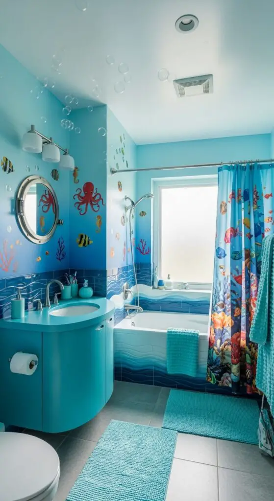 Complete the metamorphosis with bubble-effect lighting and wave-patterned tiles that’ll make bath time an exhilarating underwater excursion for any child. Consider incorporating marine themes through playful nautical elements like ship wheels, treasure chests, or porthole mirrors to enhance the underwater adventure atmosphere.