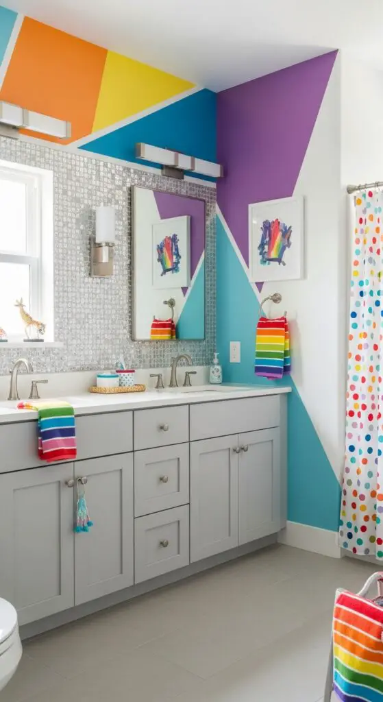 Add glitter and sparkle accents through mosaic tiles or cabinet hardware for playful texture. Metallic and shimmery finishes on faucets, mirrors, and light fixtures amplify the design beyond basic color blocking. You can also incorporate rainbow elements through towels, artwork, or shower curtains for budget-friendly alteration.