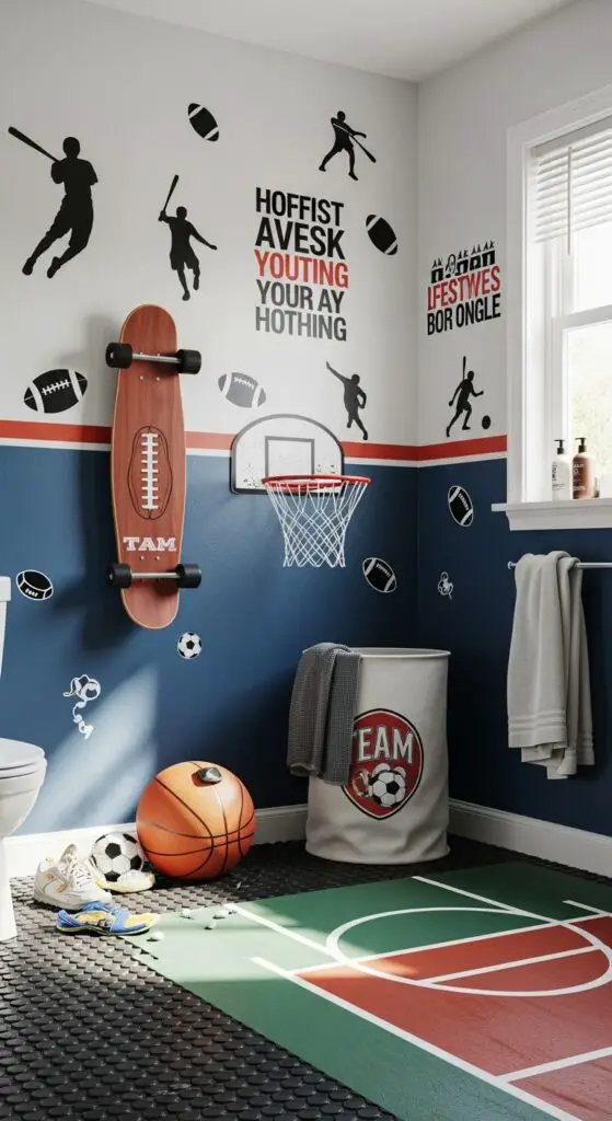 Install skateboard decor as towel racks or floating shelves for storing toiletries and bath essentials. Design fitness equipment storage solutions using basketball hoops as hampers or soccer ball containers for bath toys. Add rubber flooring with sport court patterns for safety and authenticity. Consider installing pull-up bars or resistance band anchors to encourage movement during bathroom visits.
