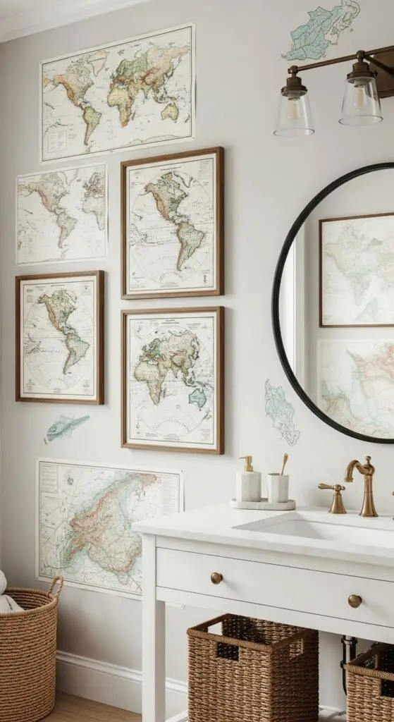 Install waterproof vintage-style prints behind glass frames to protect against moisture while maintaining authentic appeal. Historical exploration maps featuring famous expeditions create captivating focal points above vanities or beside mirrors.