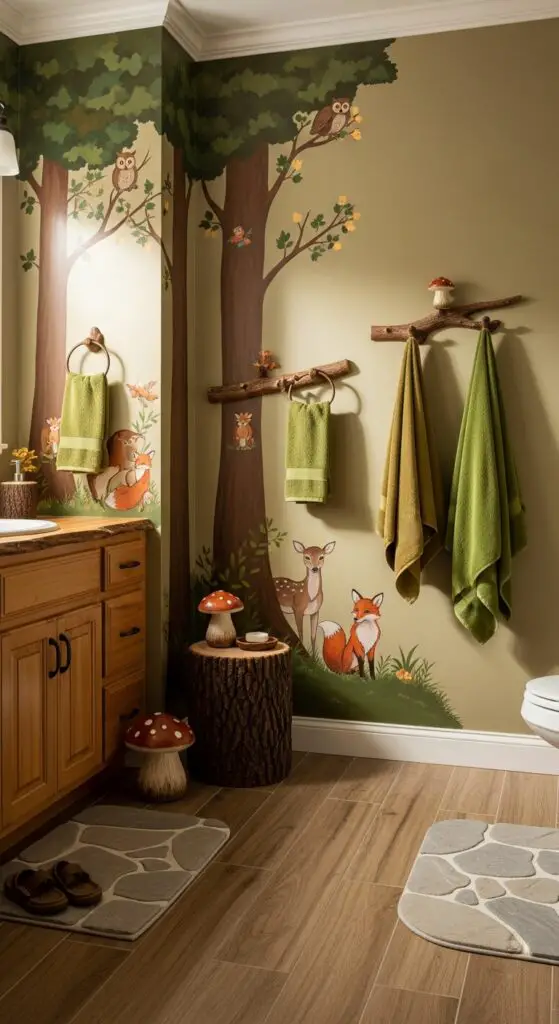 Paint murals featuring woodland creatures like foxes, deer, and owls across accent walls for visual interest. Choose earth-tone color palettes with greens, browns, and warm oranges that’ll appeal to all kids. Add forest floor bath mats and tree stump storage stools for functionality.