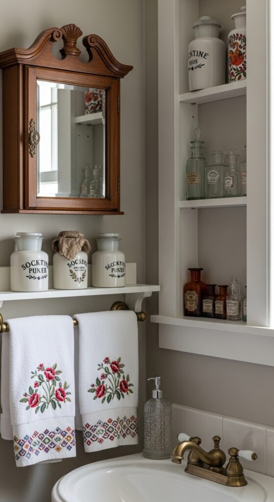 Display nostalgic accessories such as old-fashioned soap dispensers, decorative glass bottles, and embroidered hand towels on open shelving. Add character with period-appropriate artwork, vintage mirrors with decorative frames, and classic wall sconces that cast warm, inviting light throughout your space for maximum retro appeal.