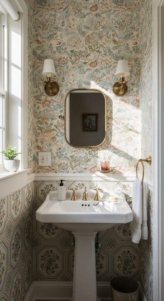 Bold floral wallpaper featuring roses, peonies, or botanical prints creates dramatic focal points behind vanities or across accent walls. Consider art deco patterns from the 1920s or Victorian-era designs for authentic period charm. Don’t fear mixing patterns—pair smaller geometric prints with larger florals for visual interest.