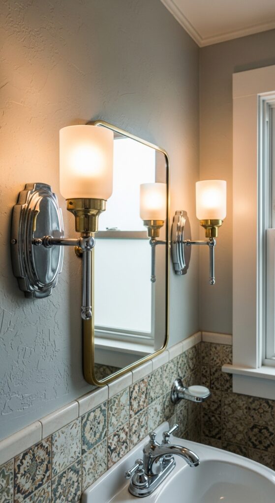Highlight vanity lighting fixtures above your mirror to create focal points that blend function with historical accuracy. Install Art Deco-inspired wall mounts featuring geometric patterns and sleek chrome finishes. Use candelabra style bulbs in your fixtures to enhance the vintage aesthetic while distributing warm, flattering light that complements your retro design vision perfectly.