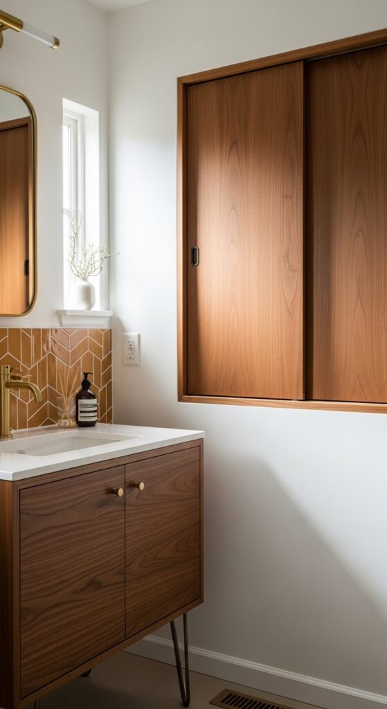 Install recessed wall storage with sliding panels to maintain the uncluttered aesthetic while maximizing space efficiency. Select geometric subway tiles in warm earth tones, paired with brass fixtures that complement the period’s signature materials. You’ll create a timeless retreat that balances form with function, embodying mid-century modern’s revolutionary approach to interior design.