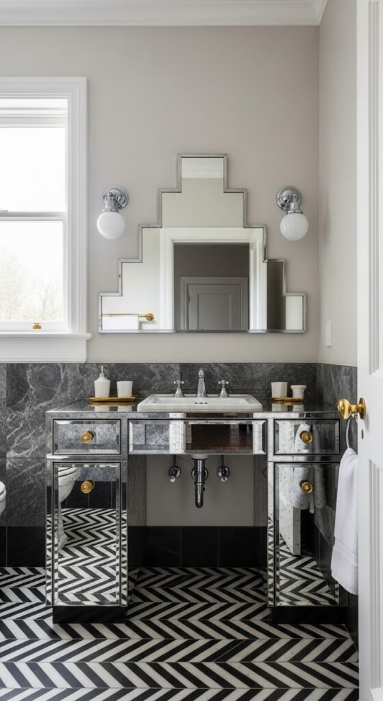 Add geometric mirrors with stepped frames, chrome fixtures, and vintage-inspired lighting to complete your sophisticated 1920s conversion. Complement these vintage elements with sleek fixtures that maintain the era’s emphasis on refined craftsmanship while ensuring modern functionality.