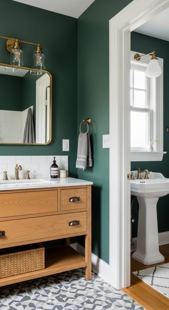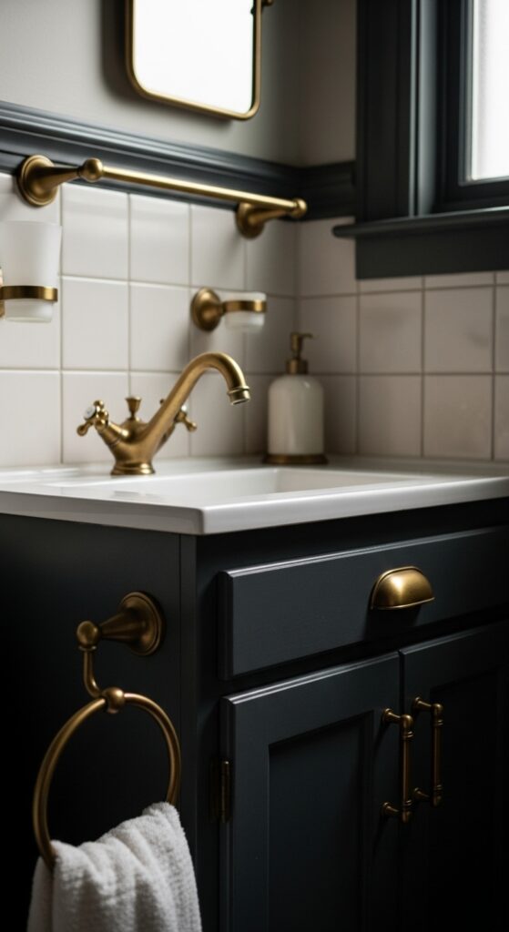 Install a sleek modern vanity with vintage accents like antique drawer pulls, classic mirror frames, or reproduction lighting fixtures. Don’t hesitate to incorporate bold wall colors that reflect your era of choice—deep emerald greens or rich burgundies work beautifully.