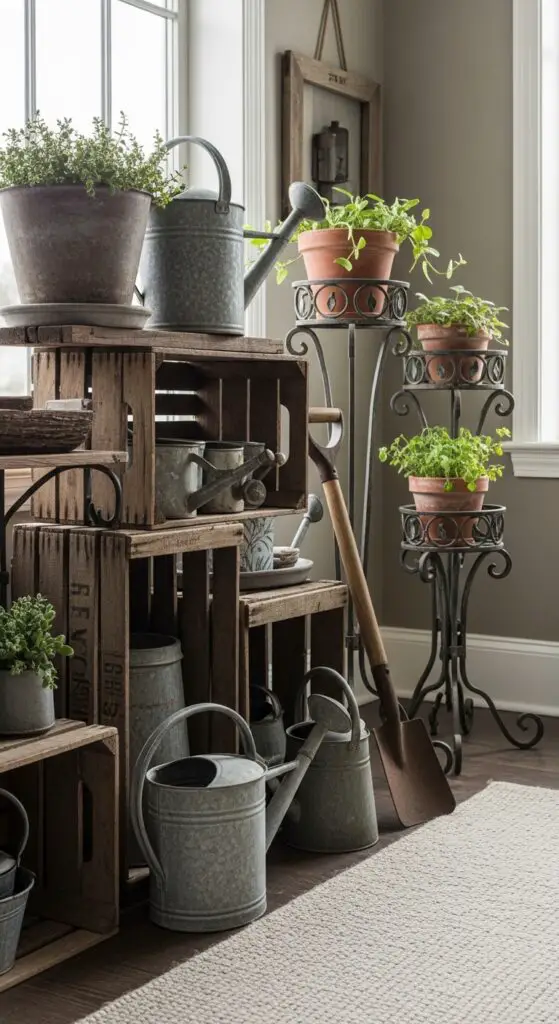 Use rustic wooden crates as versatile storage solutions or display platforms for plants and seasonal collections. Stack them vertically for bookshelf alternatives or arrange horizontally as coffee table foundations. Incorporate aged metal accents like galvanized watering cans, vintage garden tools, or wrought iron plant stands to add textural contrast.