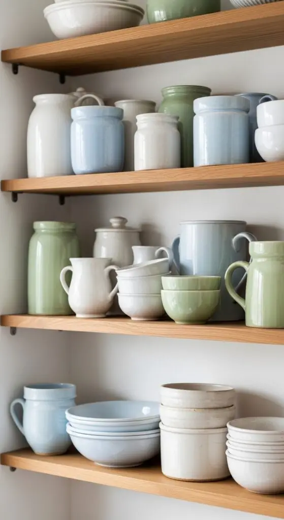 Group vintage pieces by color palette to create cohesive displays that feel intentional rather than cluttered. Arrange collections by height and size, placing taller vases behind shorter bowls for visual depth. Mix different textures like glossy glazes with matte finishes to add interest.
