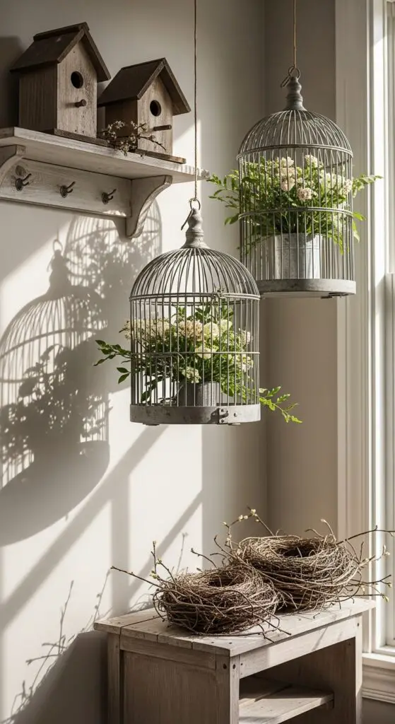 Bird cages and nests bring an enchanting touch of nature indoors while perfectly capturing that vintage spring aesthetic you’re after. Hang vintage bird cages in natural light near windows where they’ll catch morning sunbeams and create beautiful shadows. Fill empty cages with fresh greenery, delicate flowers, or battery-operated fairy lights for magical ambiance.