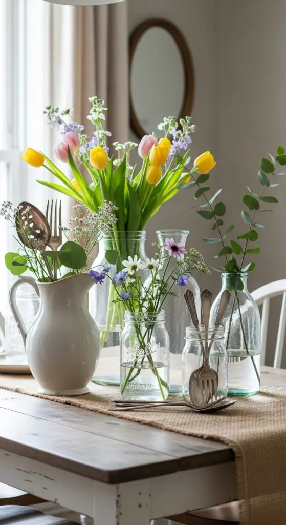 When you place fresh spring blooms in antique vessels and mason jars, you’re creating stunning focal points that blend natural beauty with nostalgic charm. I’ve found that mixing different container heights and textures adds visual interest throughout your space.