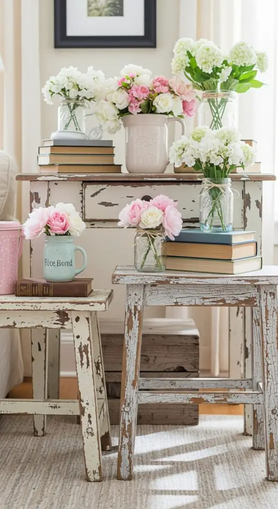 Create stunning distressed furniture vignettes by layering different textures and heights throughout your space. Place a worn wooden stool beside a chippy paint side table, then add vintage books and mason jar florals. Rustic accent pieces like distressed artwork and weathered wooden signs enhance the authentic vintage atmosphere you’re cultivating for spring.