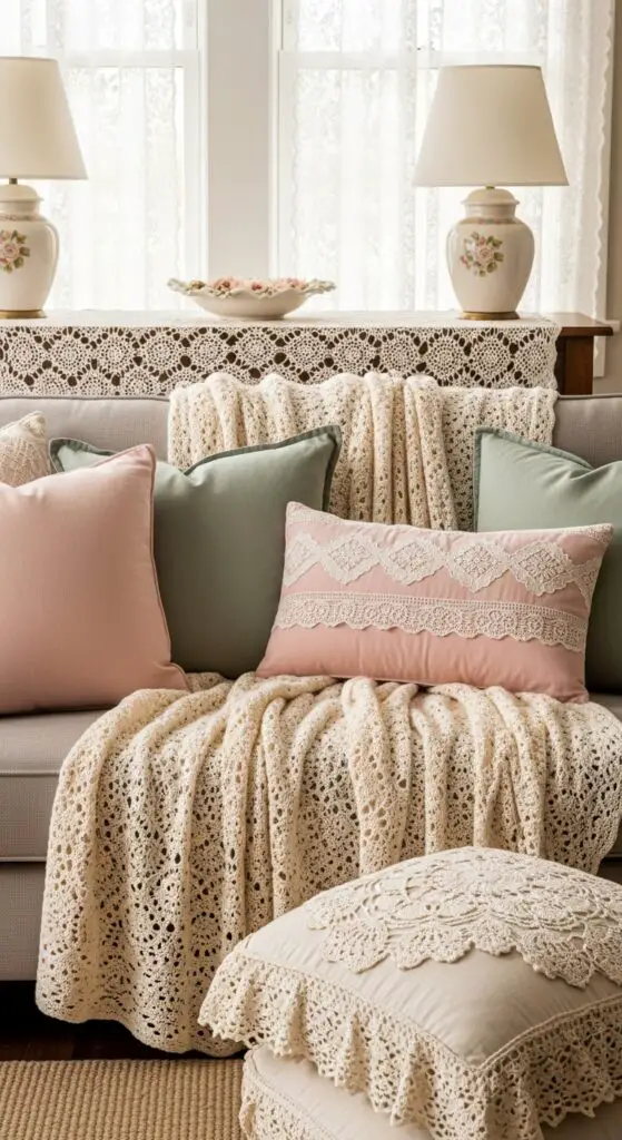 You’ll want to use crocheted doilies as table runners or underneath lamp bases to add authentic vintage charm. Don’t forget to incorporate lace accents through curtain panels or pillow edges—they create beautiful filtered light that enhances your room’s romantic atmosphere. The combination of light textures with delicate patterns creates visual depth while maintaining the gentle aesthetic that defines spring decorating.