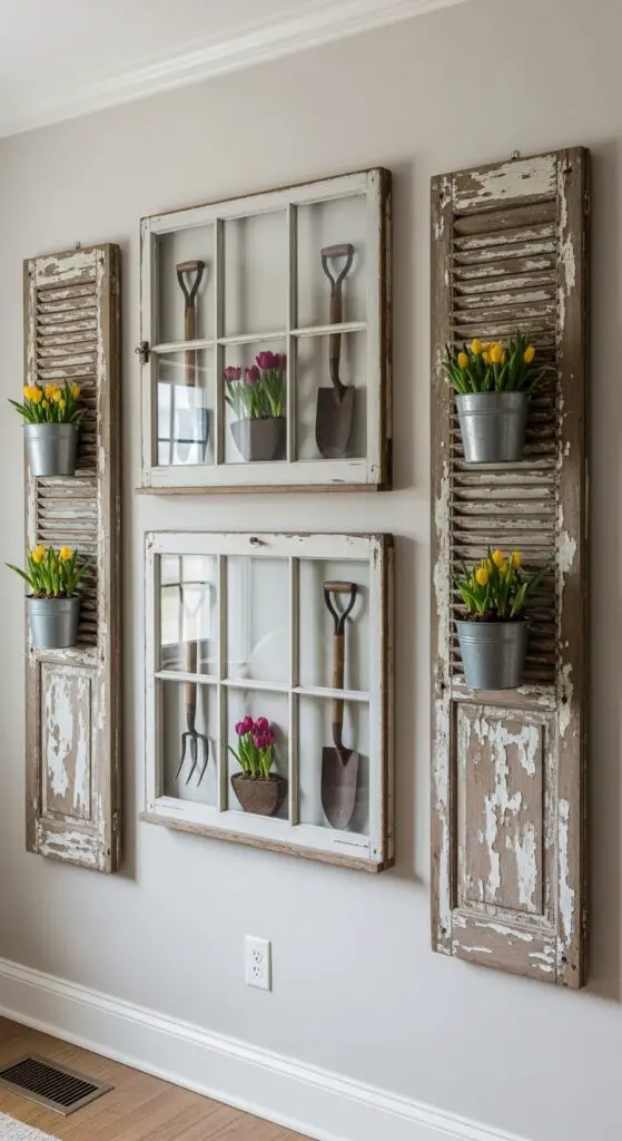 Old windows and shutters convert into stunning focal points that showcase your seasonal collections with authentic vintage character. I’ve found these designer salvage pieces create perfect backdrops for spring displays. Mount old window frames on walls to create shadow boxes filled with fresh flowers or vintage garden tools.