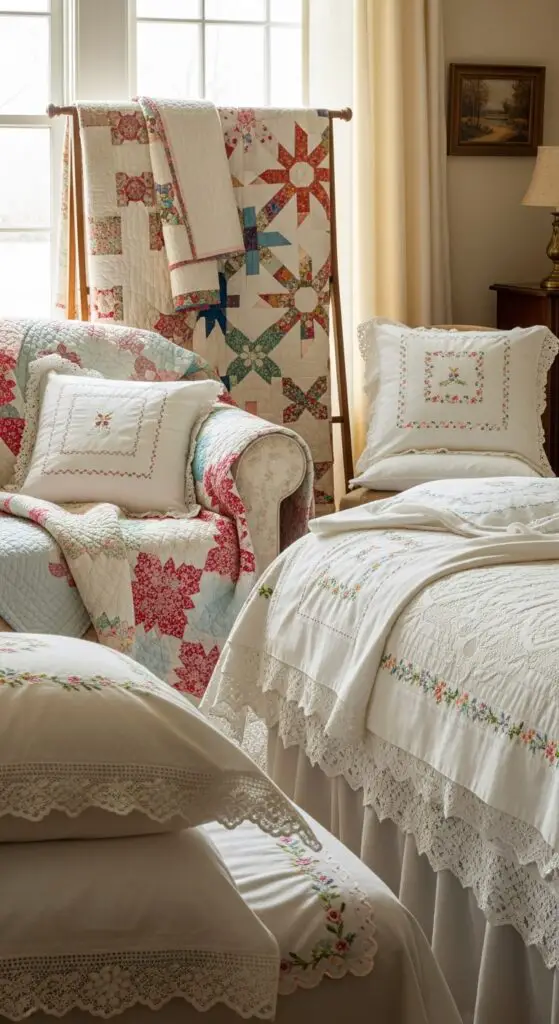Heritage quilts and embroidered linens bring authentic vintage charm to your spring decorating while celebrating the craftsmanship of previous generations. I recommend draping colorful quilts over sofas or displaying them on quilt racks near windows where natural light highlights intricate stitching patterns.