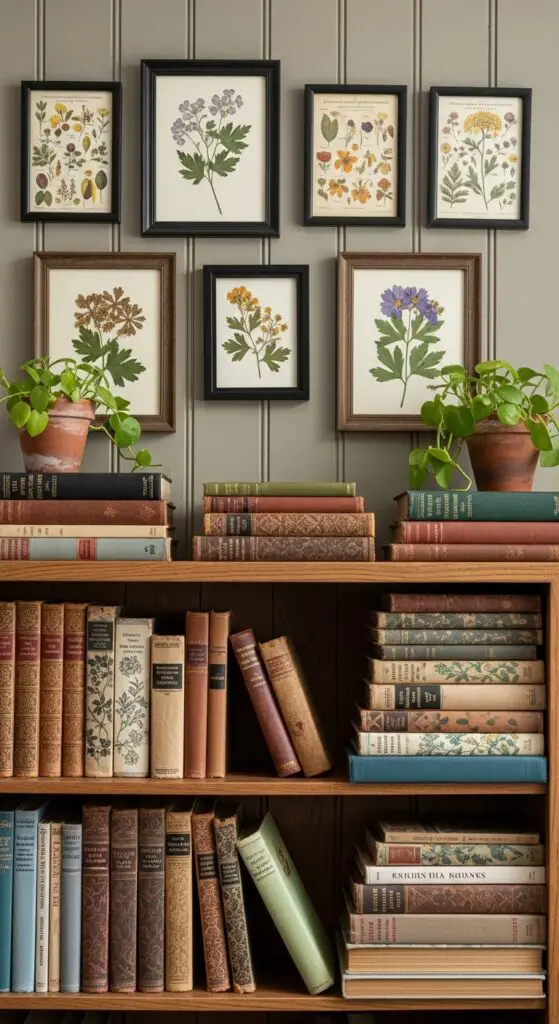 Weathered book spines and pressed botanical prints create an instant scholarly charm that alters any room into a curated sanctuary of natural history. I recommend grouping vintage botanical field guides with leather-bound classics on floating shelves or antique bookcases.