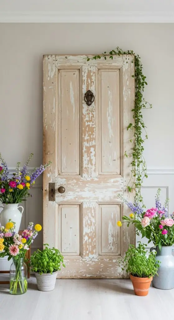 Position your altered door behind seasonal arrangements of fresh flowers, potted herbs, or climbing vines. The weathered texture creates perfect contrast against bright spring colors, while the door’s natural patina tells its own story of timeless elegance.